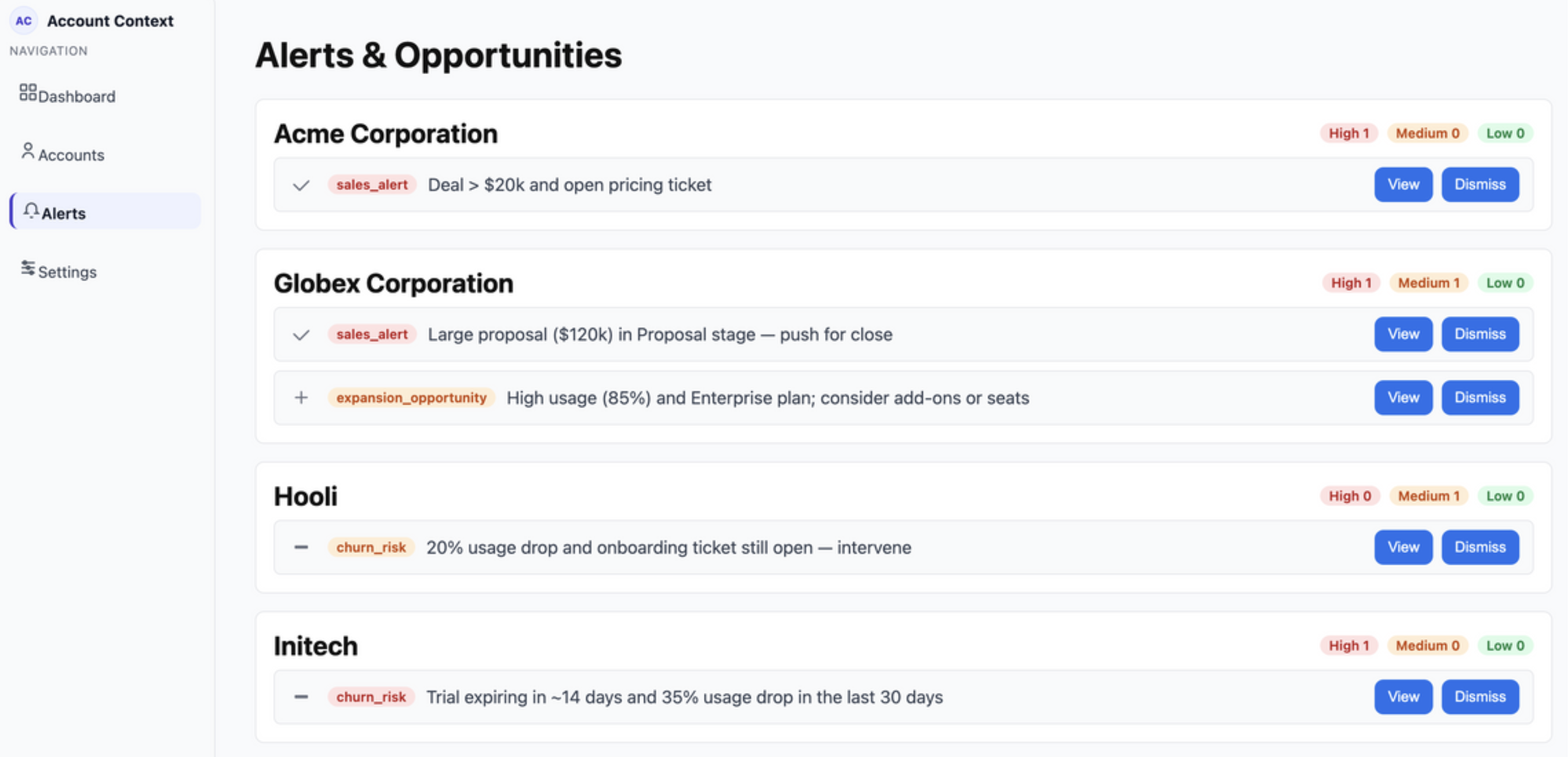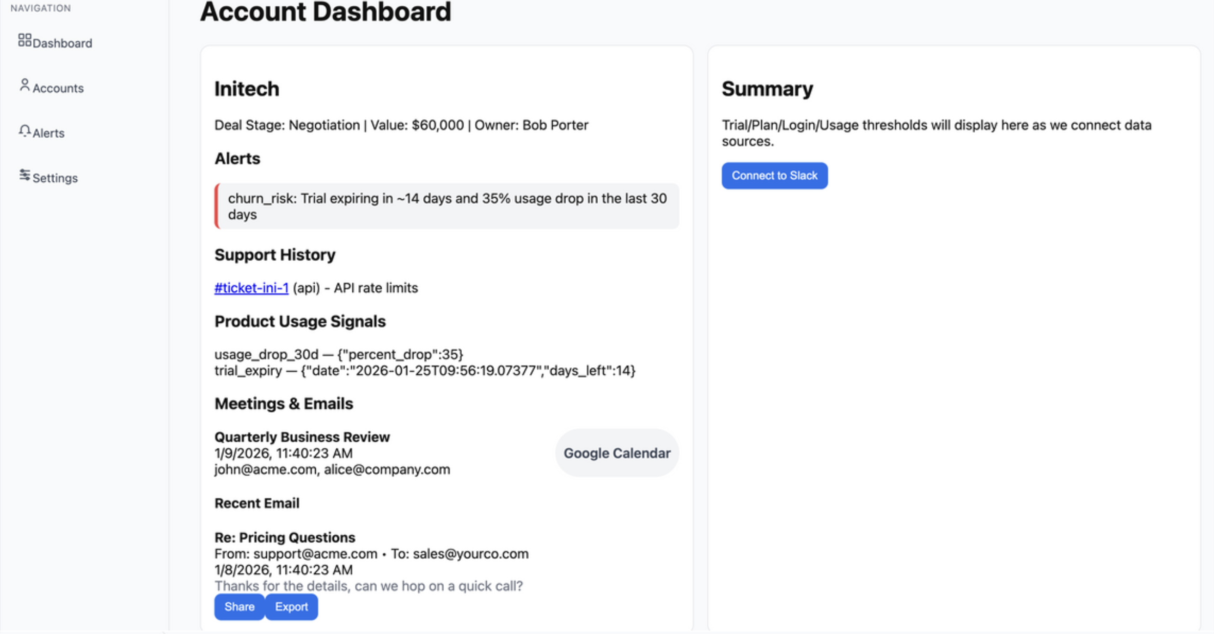 - Built a lightweight GTM intelligence layer (“Sales Context Card”) for account-level interpretation